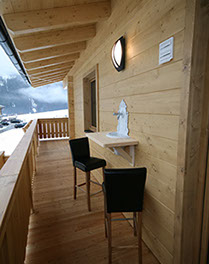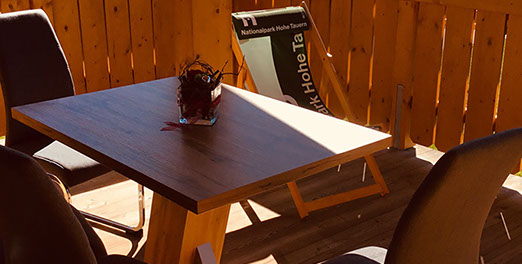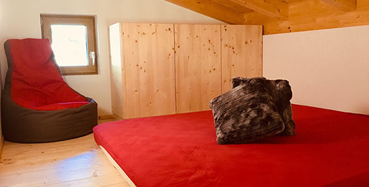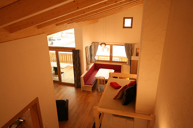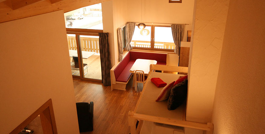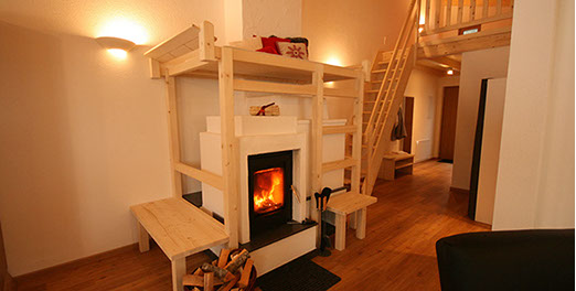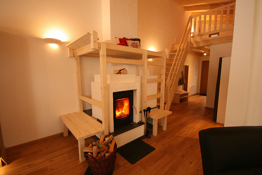 WOHNBEREICH: Garderobe, ausziehbare Schlafcouch mit Rollmatratze, Relaxsessel, Flat-SAT-TV, Osttiroler Hinterofen mit Ofenbank und Liegefläche, Stiege zum „ADLERHORST" mit Matratzenlager und Sitzsack