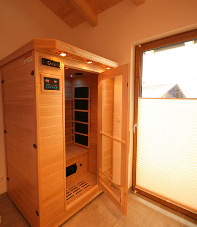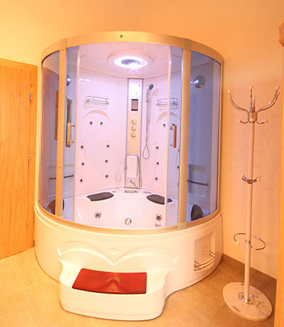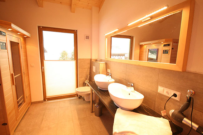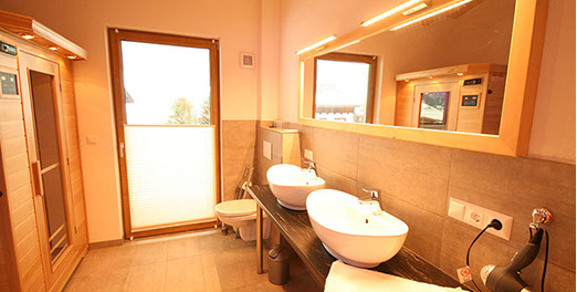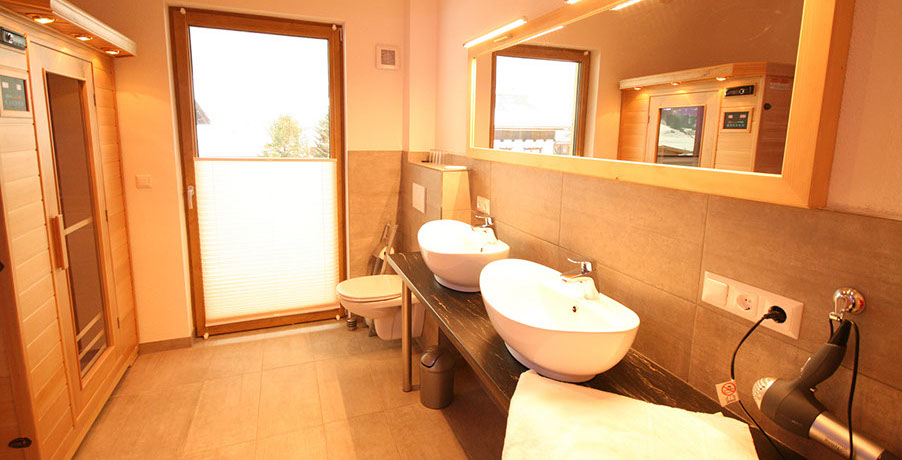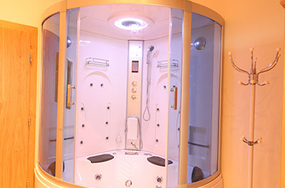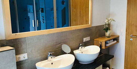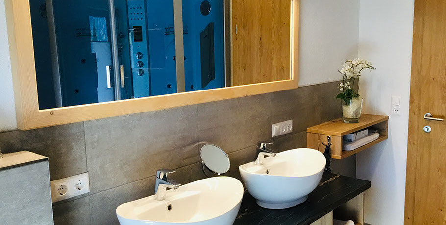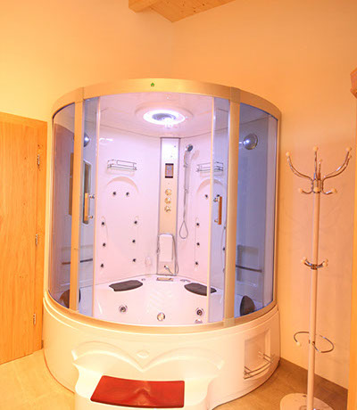 1 BADEZIMMER mit Erlebnisduschtempel (Handbrause, Regenfalldusche, Dampfbad, Whirlpool), Infrarotkabine, Doppelwaschbecken, Föhn, WC, Ausgang zum Balkonbrunnen mit Sitzgelegenheit