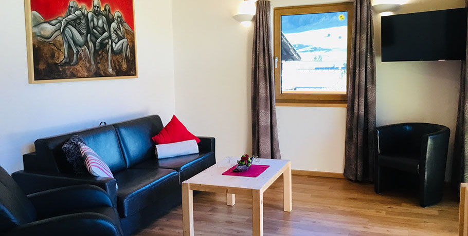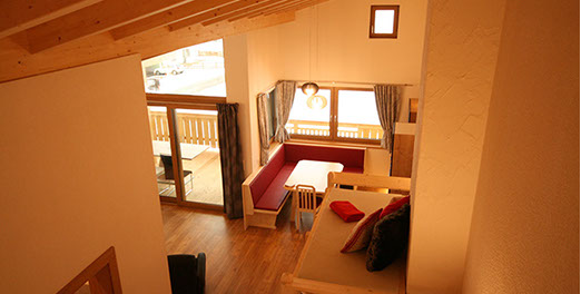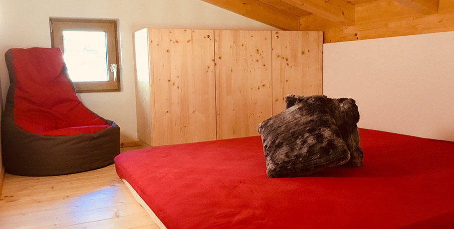 WOHNBEREICH: Garderobe, ausziehbare Schlafcouch mit Rollmatratze, Relaxsessel, Flat-SAT-TV, Osttiroler Hinterofen mit Ofenbank und Liegefläche, Stiege zum „ADLERHORST" mit Matratzenlager und Sitzsack