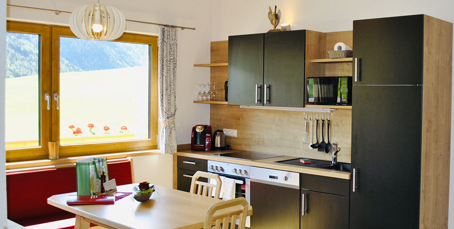 WOHNKÜCHE: E-Herd mit 4 Platten Ceranfeld, Backofen, Mikrowelle, Kühl-Gefrierkombi, Kaffeemaschine Tassimo von Bosch, Kaffeefilteraufsatz mit Thermoskanne, Wasserkocher, Geschirrspüler, Essbereich
