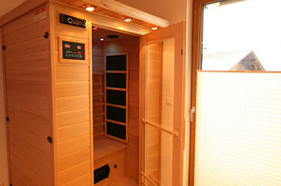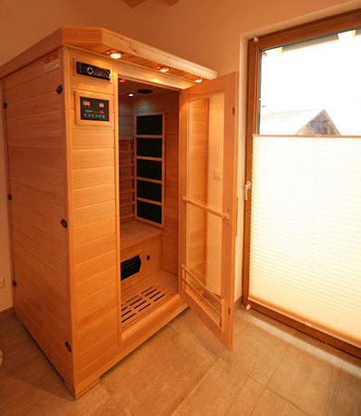 1 BADEZIMMER mit Erlebnisduschtempel (Handbrause, Regenfalldusche, Dampfbad, Whirlpool), Infrarotkabine, Doppelwaschbecken, Föhn, WC, Ausgang zum Balkonbrunnen mit Sitzgelegenheit
